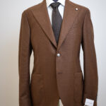 Colore e Tessuto: La giacca presenta una ricca tonalità di marrone bruciato/terra di Siena, impreziosita da una notevole texture a micro-fantasia o “occhio di pernice” che aggiunge profondità e carattere visivo al tessuto, probabilmente lana o un misto pregiato.