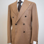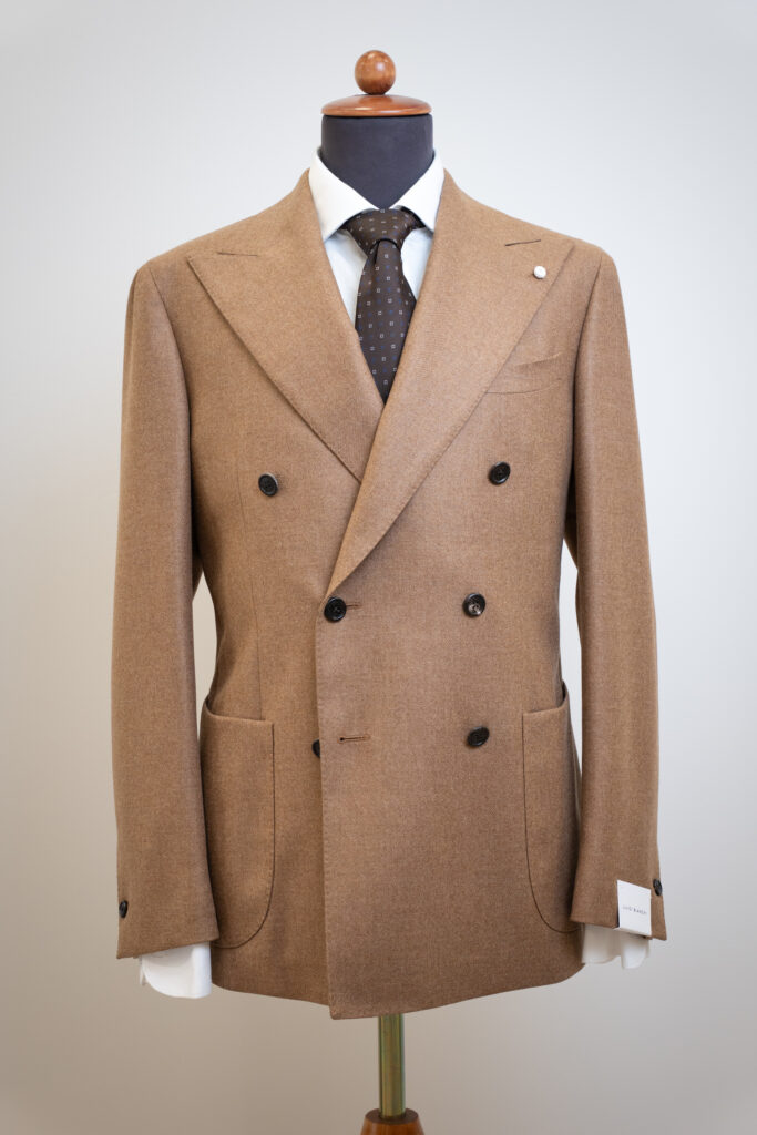 Questa giacca doppiopetto in pura lana color cammello esprime la quintessenza dello stile sartoriale italiano: spalle morbide, linea asciutta e proporzioni equilibrate. I revers ampi a lancia sottolineano il carattere deciso del capo, mentre le tasche applicate e i bottoni in corno scuro ne completano l’eleganza rilassata. Internamente, la costruzione leggera garantisce comfort e naturalezza nei movimenti, rendendo questa giacca perfetta sia per l’ambiente formale sia per un’eleganza quotidiana più disinvolta.