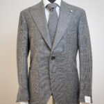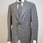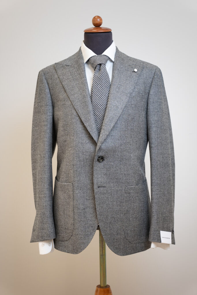 Un equilibrio perfetto tra tradizione e modernità. Questa giacca monopetto da uomo reinterpreta il classico motivo Principe di Galles con un gioco di tonalità calde grigio, marrone e sottili accenti bordeaux che ne esaltano la profondità visiva.