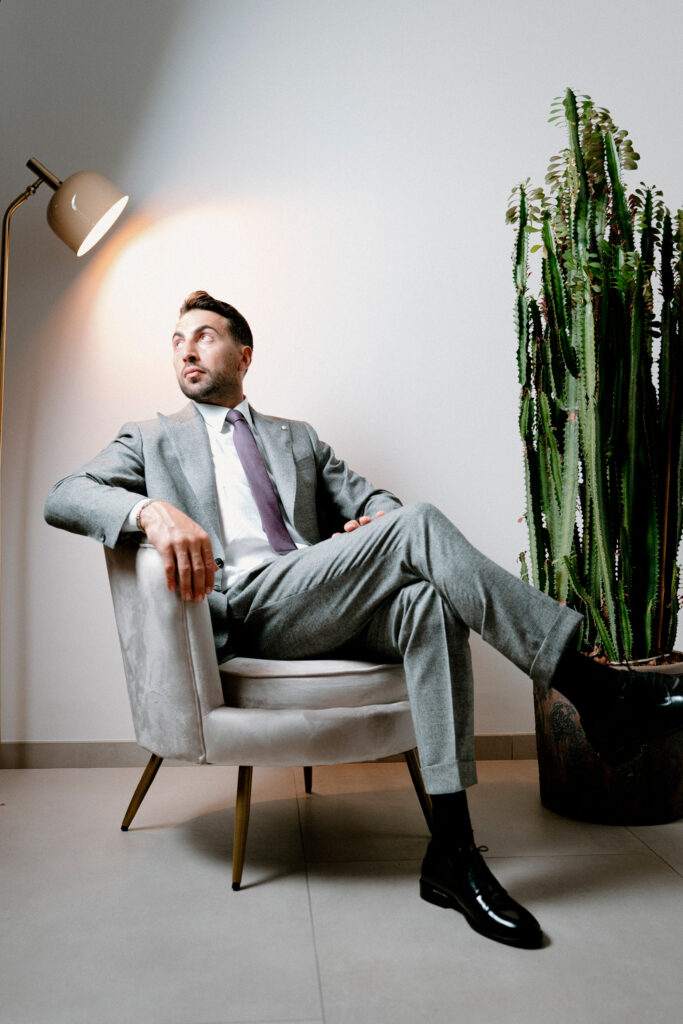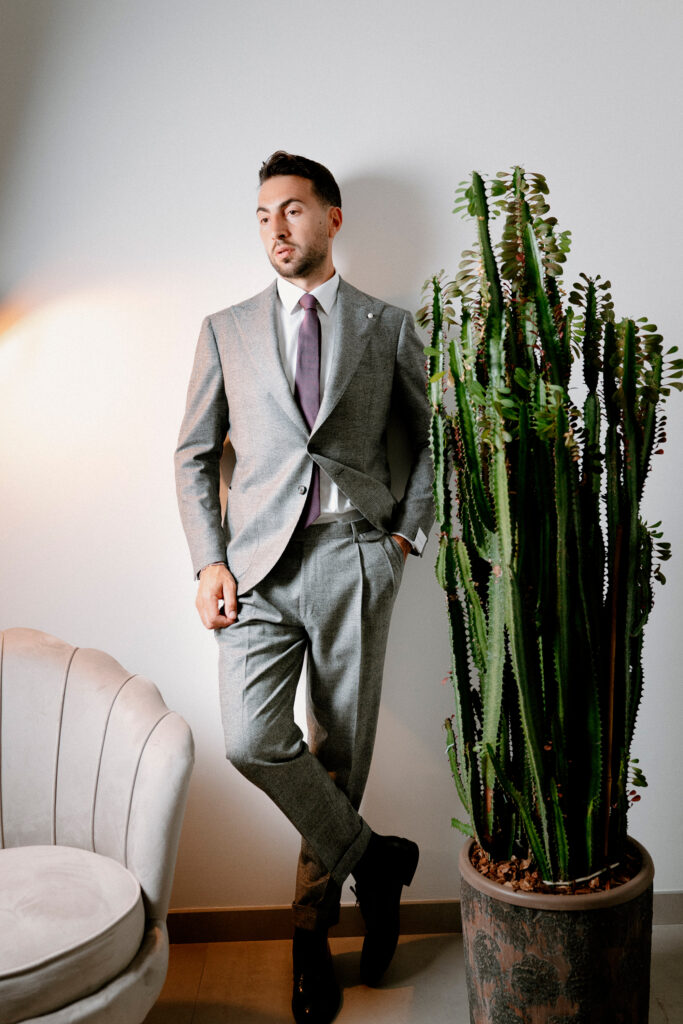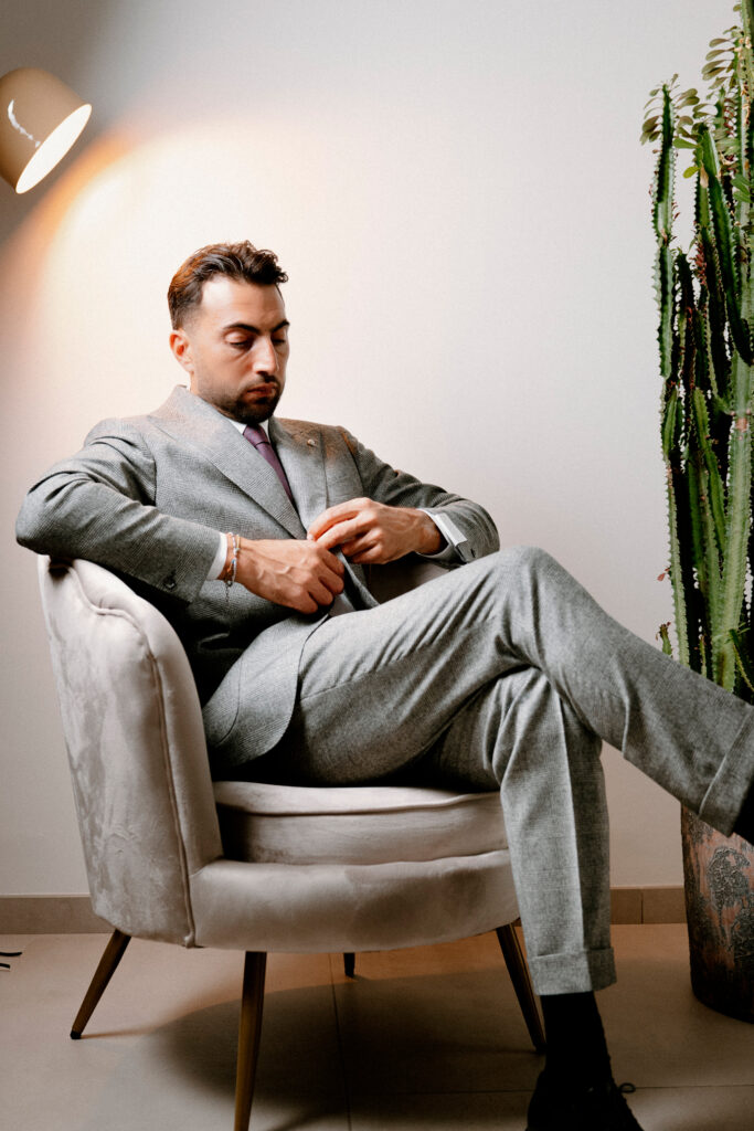 Il taglio asciutto e deciso disegna una silhouette elegante, mentre il tessuto in jersey garantisce morbidezza e libertà di movimento. Il rever ampio a lancia e la chiusura a 2 bottoni bottoni definiscono un carattere forte, pensato per l’uomo che esprime la propria personalità attraverso i dettagli.